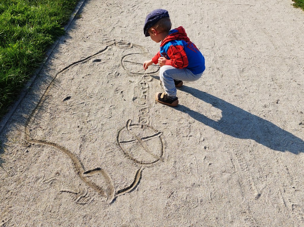 Na dworze można malować. Da się rysować patykiem po piasku albo kredą po chodniku.
