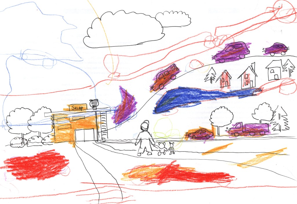 – Narysujemy swoją kolorowankę. Co ty na to? – Tak. Ale z autami. – Z autami. Coś jeszcze? – Sklep. Rysuję sklep, auta… – I jeszcze ja. I Kubuś i Prosiaczek. – Idziecie dokądś? – Do sklepu… Po miodek. I jeszcze tutaj auta… – Osobowe czy ciężarowe? – Osobowe. – Tu, w górze? – Tak. – To może dorysujemy górę? I domki na niej… – Tak. – A jaka jest pogoda? ….. itd. I tak rysujemy kolorowankę. – Skończone? – Tak. – To teraz pokoloruj.