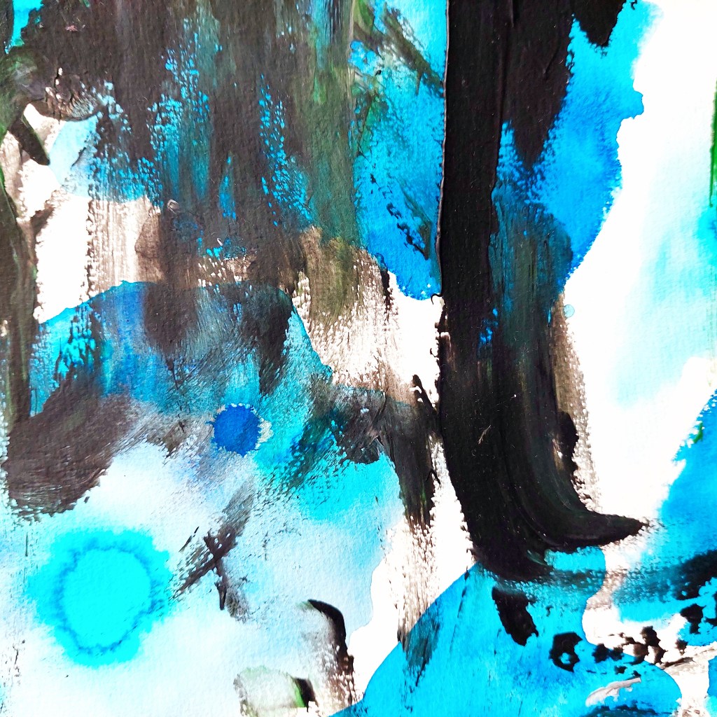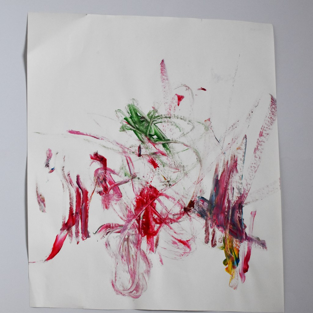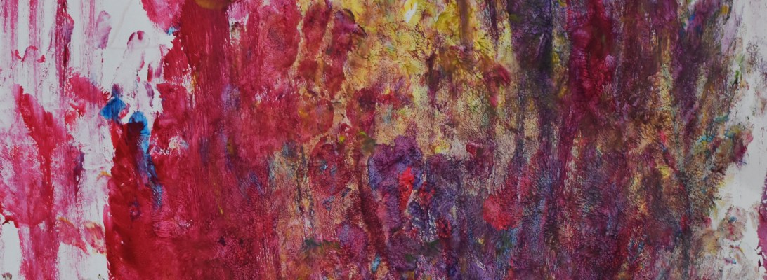 Można działać jednym kolorem i obserwować intensywność przy nakładaniu się kolorów albo mieszać barwy. Wpuszczać akwarelę na plamę wody rozlaną na papier i patrzeć jak się rozchodzi… Na tym zdjęciu jest akwarela w płynie i farby do malowania palcami. Technika mieszana.